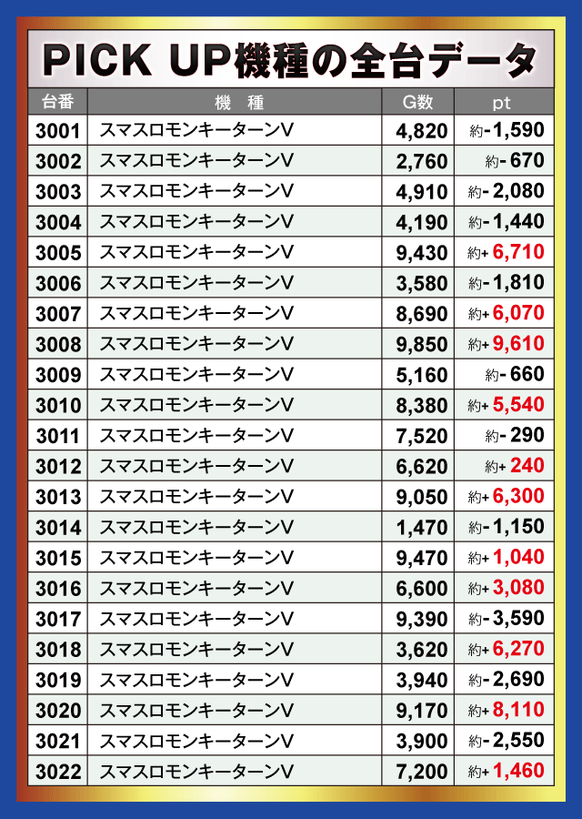 楽園上新屋店のPICK UP機種は全3機種。特に目立っていたのが、未だ人気の衰え知らずな『スマスロモンキーターンV』で、3008番台の+9,000pt超、3020番台の+8,000pt超の他に、+6,000pt超が4台も飛び出しファンを喜ばせていた。