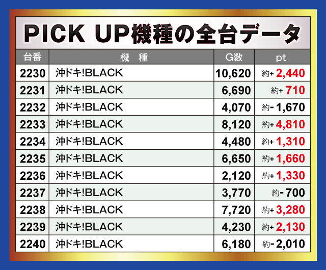 楽園沼津店のPICK UP機種は『沖ドキ!BLACK』。2233番台の+4,000pt超をはじめ+3,000pt超に+2,000pt超が2台と好成績を連発させている。平均差枚も+1,200pt超を記録しており、シマ内は常に活気に満ち溢れる一日となった。