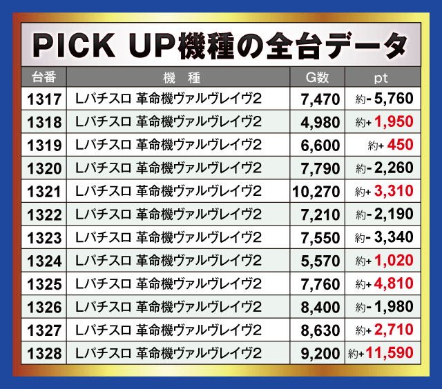 楽園袋井店の3台は飛び抜けた記録こそ無いモノの全台がプラス差枚に。本機のファンにとっては思う存分に楽しめた一日となったに違いないだろう。