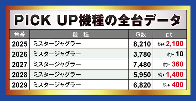 楽園袋井店のPICK UP機種となった『ミスタージャグラー』は、全5台中4台がプラス差枚に。惜しくもプラス域に届かなかった台のマイナスもごく僅かなもので、この圧倒的な安定感はまさに本機ならではの魅力と言えるだろう。