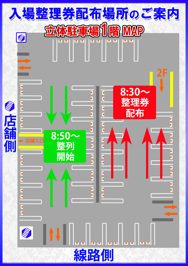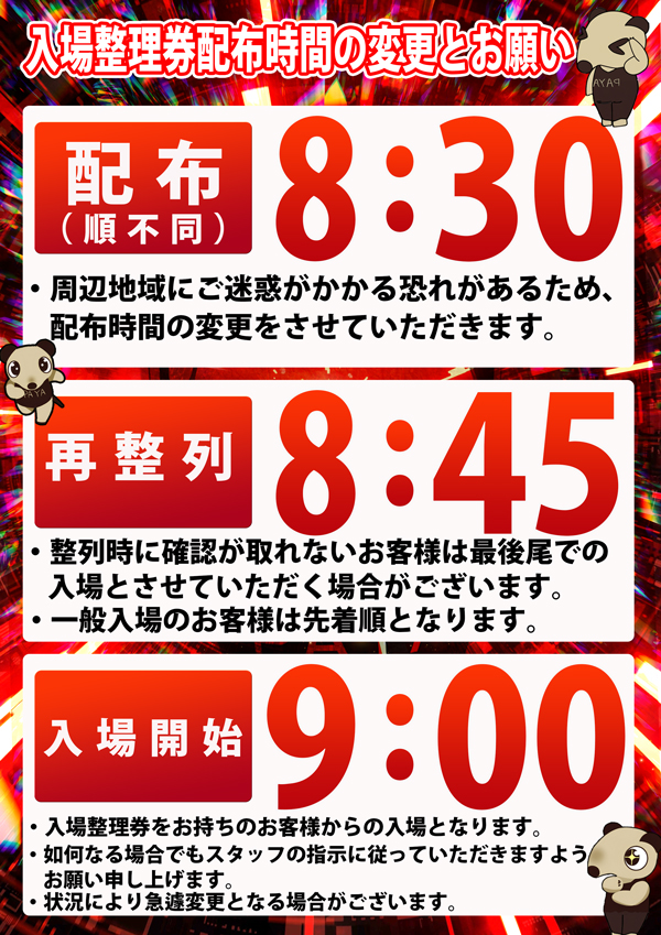①抽選開始時間【8:45~】 ②入場前再整列時間【8:50~】 ③入場開始時間【9:00~】 |