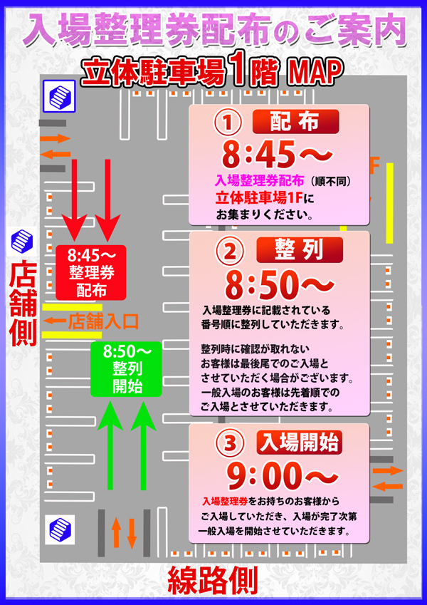 ①抽選開始時間【8:45~】 ②入場前再整列時間【8:50~】 ③入場開始時間【9:00~】 |