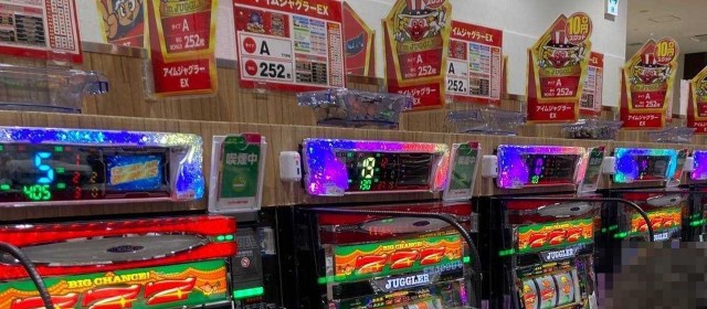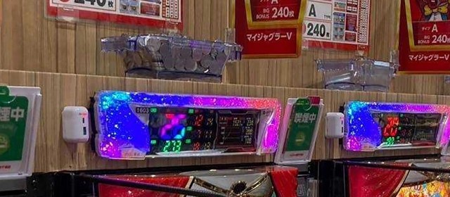 最初に目が惹かれたのはボーナスタイプ。『ファンキージャグラー2』『マイジャグラーⅤ』『アイムジャグラーEX』『新ハナビ』の頭上にはメダルの詰まった箱が見受けられた。