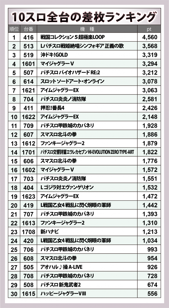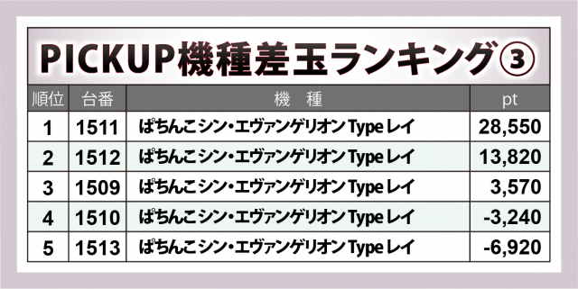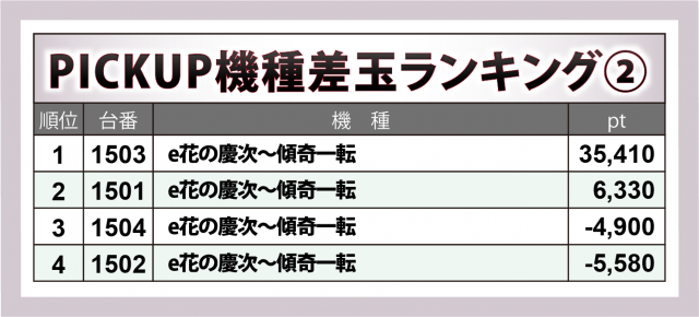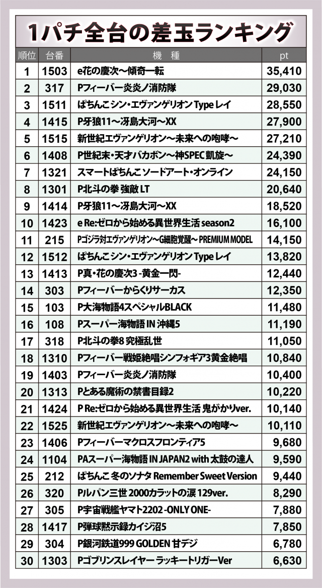 『e花の慶次〜傾奇一転』が+3万5千超で全167台の頂点に輝いたのに加え、『ぱちんこ シン・エヴァンゲリオン Type レイ』が+2万9千弱、『P牙狼11〜冴島大河〜XX』が+2万8千弱と、メジャー機種がビッグヒットを残した。