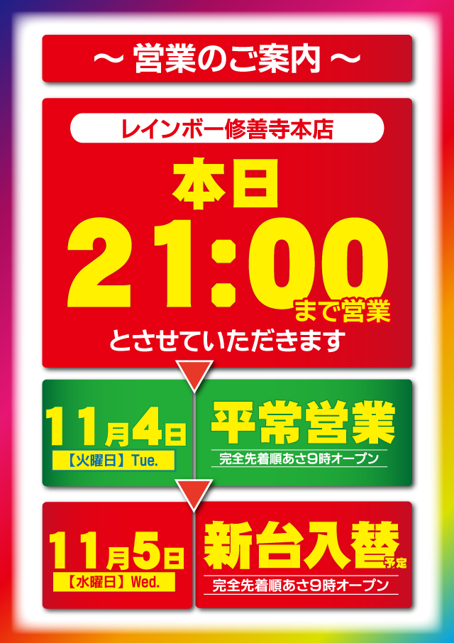 本日🌈新台入替★初日🌈このあと9時OPEN!是非!ご来店を!