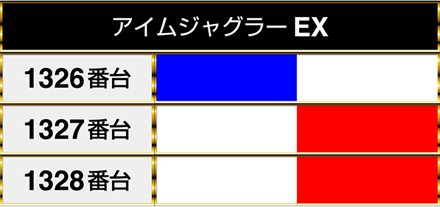 『アイムジャグラーEX』の1327番台と1328番台が並んでプラスpt。