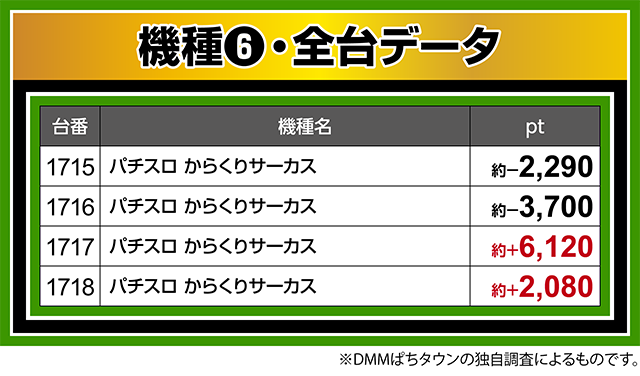4台設置の『パチスロ からくりサーカス』では、1717番台が約+6,120pt、1718番台も約+2,080ptとなった。