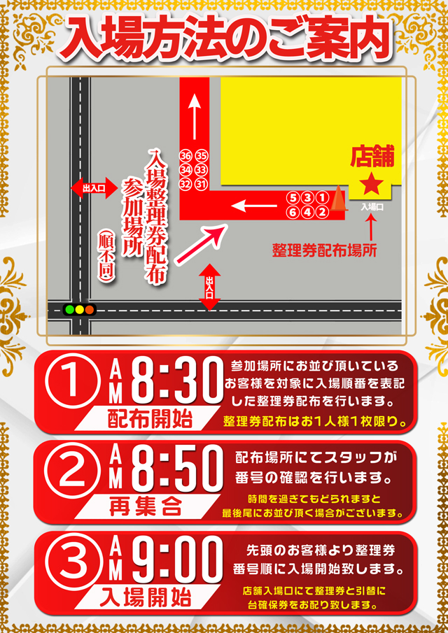 【8:30】入場整理券(順不同)配布 → 【8:50頃】再整列 → 【9:00】入場開始 |