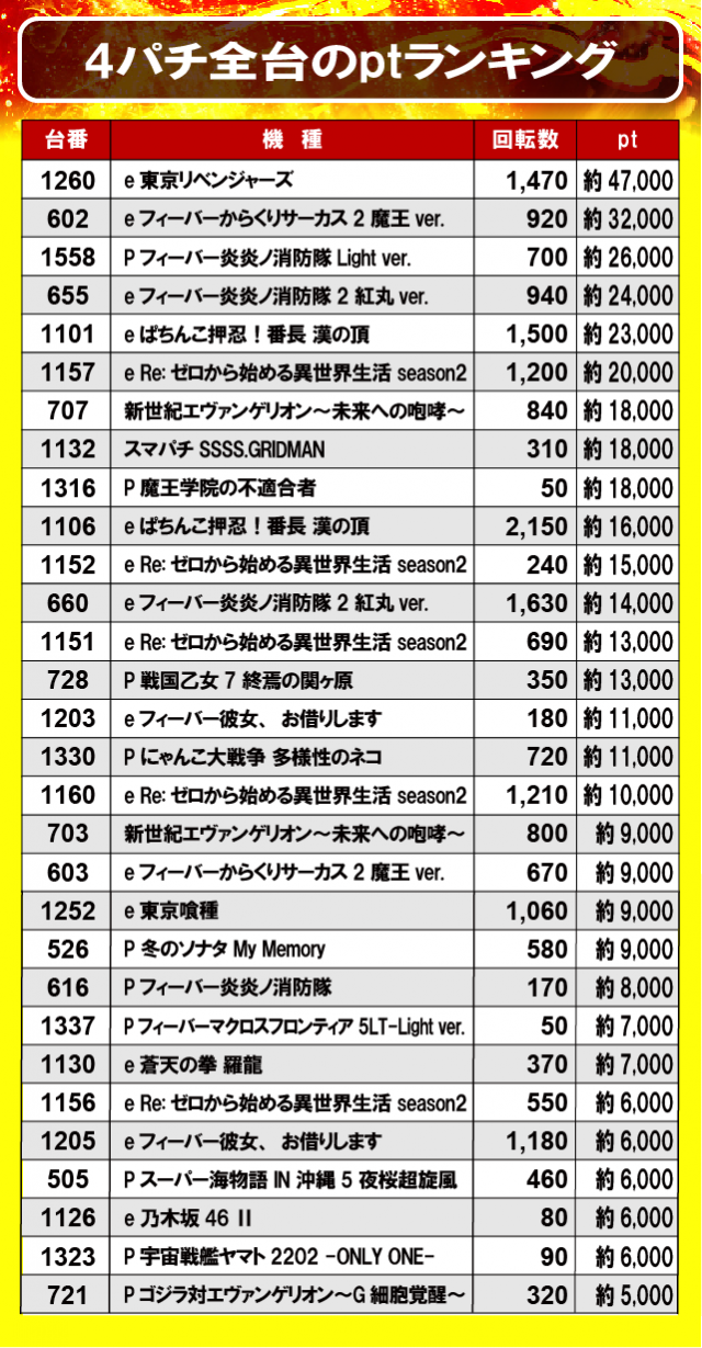 『e東京リベンジャーズ』から約47,000pt、『eフィーバーからくりサーカス2 魔王ver.』から約32,000ptを記録するなど、店内の盛り上がりに貢献する形となっていた。その他にも人気機種がズラリとランクインするなど、パチンココーナーでも盛り上がりを見せていた!