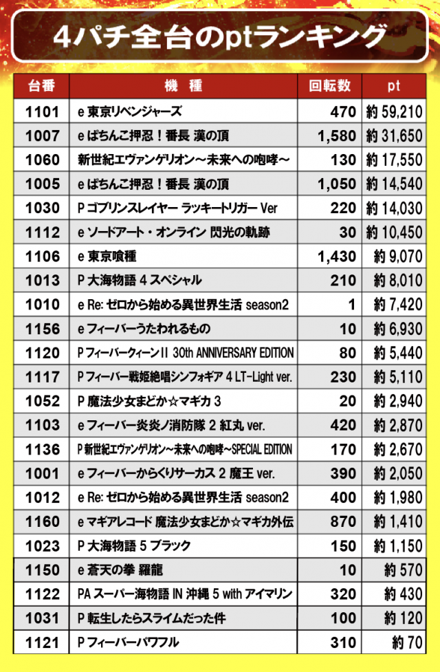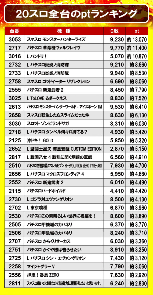 店内は大きく盛り上がっていた様子で、閉店まで絶える様子はなかった。その中で『スマスロ モンスターハンターライズ』『パチスロ 革命機ヴァルヴレイヴ』『Lバンドリ!』から万ptOVERをマークするほか、多くの機種が大台突破台に続いていた。また、メダル機もしっかりランクインしており、幅広い機種でチャンスが隠されていたようだ!