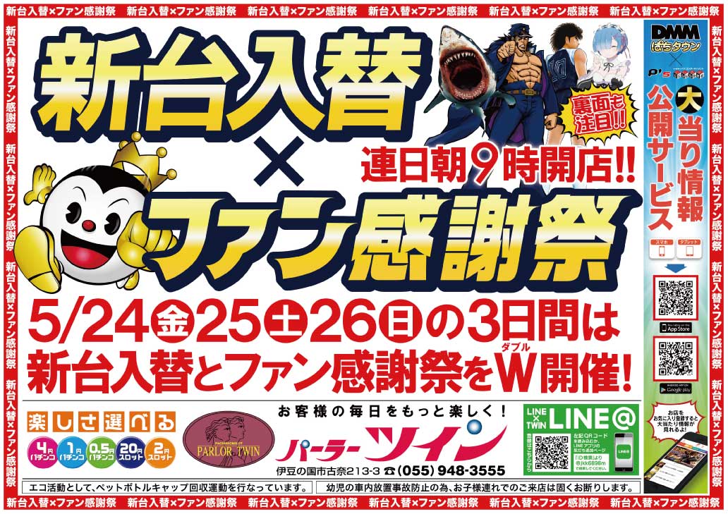 ☆新台入替☆本日25日9時オープンです!ツインにGO!💨