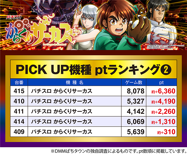 「パチスロ からくりサーカス」では、415番台が約+6,360pt。