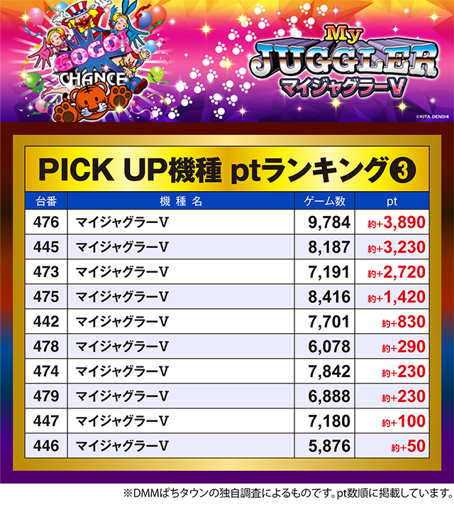 「マイジャグラーⅤ」の476番台と445番台も約+3,200pt以上。