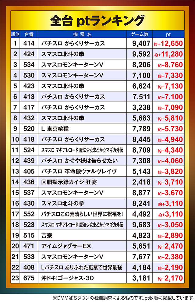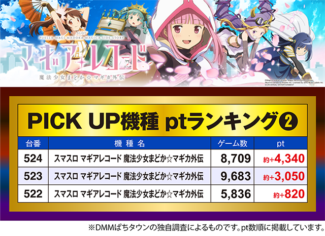 ほかにも、「L 東京喰種」の520番台や「スマスロ マギアレコード 魔法少女まどか☆マギカ外伝」の439番台など、多くの台が約+4,000ptを上回った。