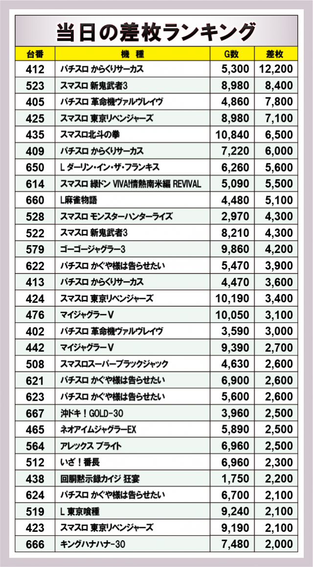 ※差枚数順に掲載しています