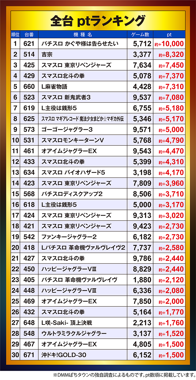 「スマスロ北斗の拳」の429番台や「L麻雀物語」の660番台なども約+7,000ptを上回った。