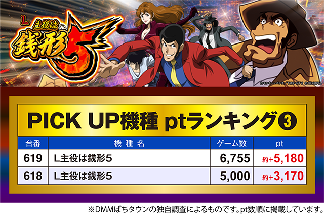 「L主役は銭形5」の619番台は約+5,180pt、618番台も約+3,170ptとなった。