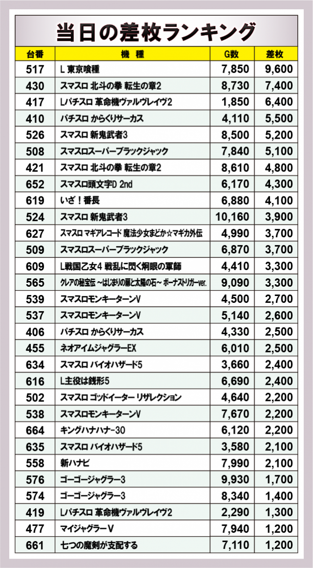 ※差枚数順に掲載しています