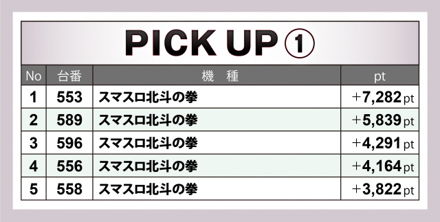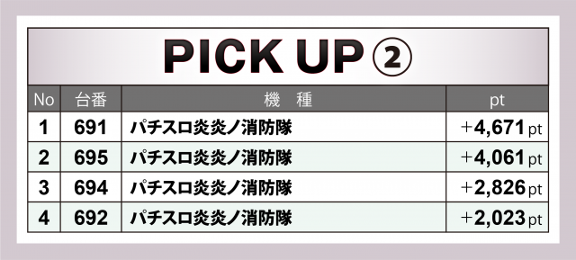続いては『パチスロ炎炎ノ消防隊』5台に注目。4台がプラスかつ全てが4桁のポイント数を残した。最も好出玉を果たした691番台は+4千6百超で、その他も好記録が連発、当コーナーはファンの喜びに沸いた。