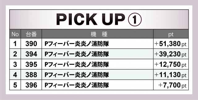 今回の注目は『Pフィーバー炎炎ノ消防隊』9台。プラスは6台と全体の約3分の2を占め、最も高いポイント数を叩き出した390番台は+5万1千オーバーとビッグヒット。その他の台も大量出玉ゲットを果たした。