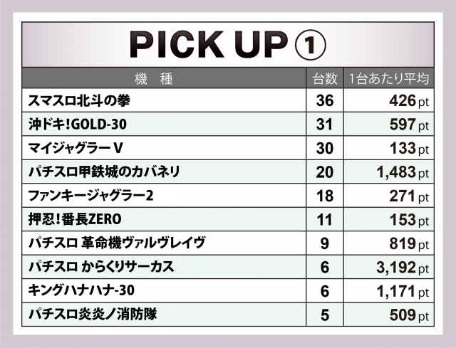 また、今回の1台あたり平均で最も高い数値となったのは『パチスロ からくりサーカス』6台だったが、比較的設置数の少ない機種にもチャンスが秘められていたことも伝わってくる。