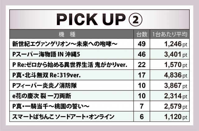 パチもスロと同じく、『新世紀エヴァンゲリオン〜未来への咆哮〜』49台といった設置の多い機種をメインにそれぞれ合計でプラスを実現、今回取り上げた8機種はいずれも1台あたりの平均が4桁をマーク。