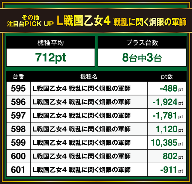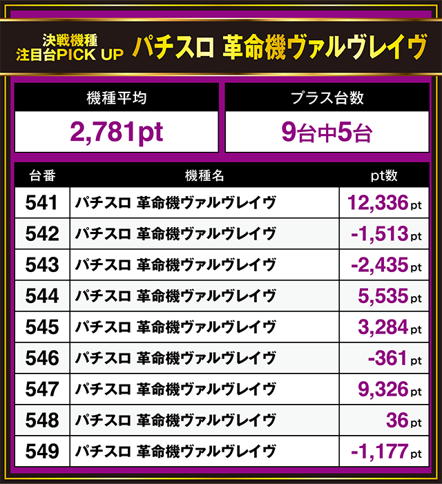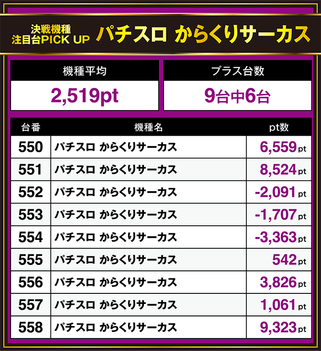 9台中6台がプラスで、558番台は+9,323ptを記録している。