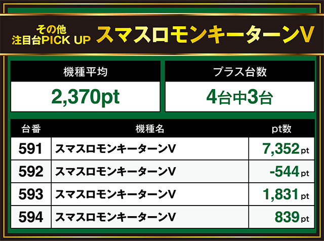 「スマスロモンキーターンV」は4台中3台がプラスで、591番台は+7,000ptオーバー!