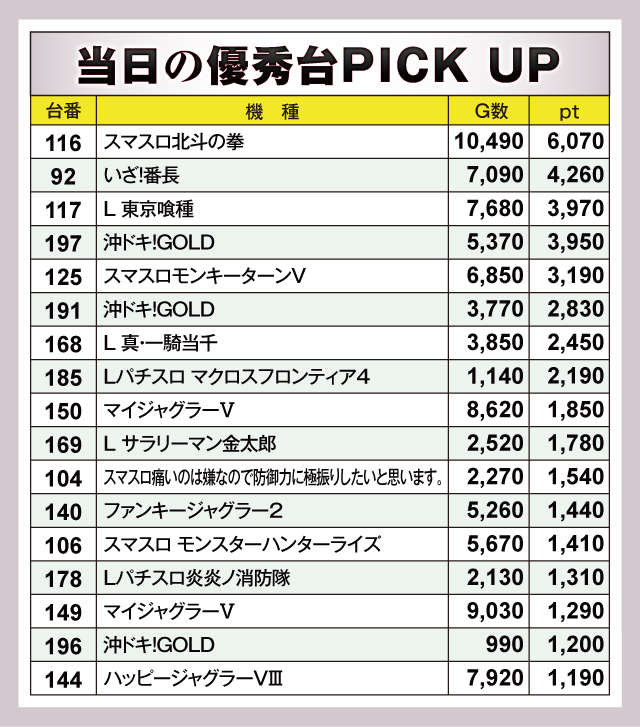 1万Gを突破した『スマスロ北斗の拳』116番台が+6,070ptと見事な成績を残している。そして『いざ!番長』92番台の+4,260pt、『L 東京喰種』117番台の+3,970pt、『沖ドキ!GOLD』197番台の+3,950ptと優秀台が並んでいた。