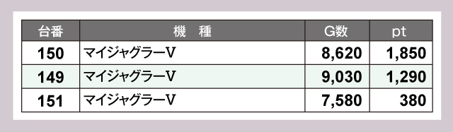 『マイジャグラーⅤ』は3台いずれも高稼働で、全台がプラスptとなっている。