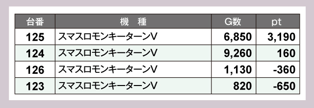 4台設置の『スマスロモンキーターンV』は2台がプラス。125番台の活躍もあり、トータルではプラスptで落ちついている。