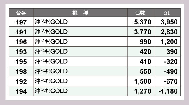 『沖ドキ!GOLD』は8台中4台がプラスで、G数が多い197番台と191番台が結果を出していた。