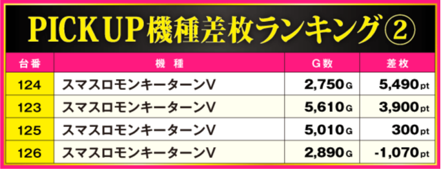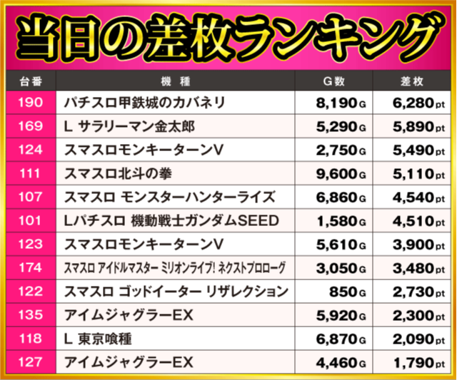 この日は、人気機種を中心にハイスコアが続出。そんな中、『パチスロ甲鉄城のカバネリ』が+6,280ptを叩き出しランキングトップに。次いで『L サラリーマン金太郎』と『スマスロモンキーターンV』、さらには『スマスロ北斗の拳』から+5,000pt超が飛び出しファンを喜ばせていた。