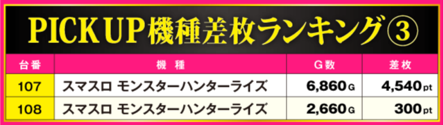 今回のPICK UP機種は全3機種。ランキング上位機種以外で目立っていたのが『スマスロ モンスターハンターライズ』で107番台が+4,540ptを記録。さらに、3機種トータルの全8台中7台がプラス差枚となっているだけに、それぞれのシマは常に活気とファンの笑顔で溢れていた。