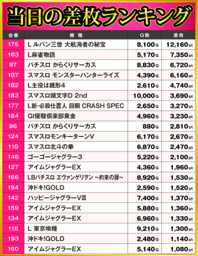 この日、最もプレイヤーの注目を集めたのが『Lルパン三世 大航海者の秘宝』で、175番台が圧巻の+12,160ptを叩き出しランキングトップに。次いで『L麻雀物語』が+7,350pt、『パチスロ からくりサーカス』と『スマスロ モンスターハンターライズ』が+6,000pt超を記録している。