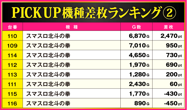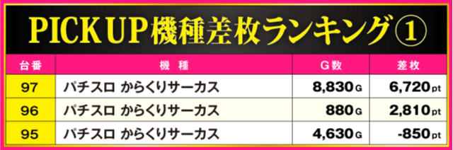 今回のPICK UP機種は『パチスロ からくりサーカス』と『スマスロ北斗の拳』の2機種。両機種とも多数の好調台が確認されており、2機種トータルの全11台中8台がプラス差枚で実戦終える見事な結果を残しファンを喜ばせていた。