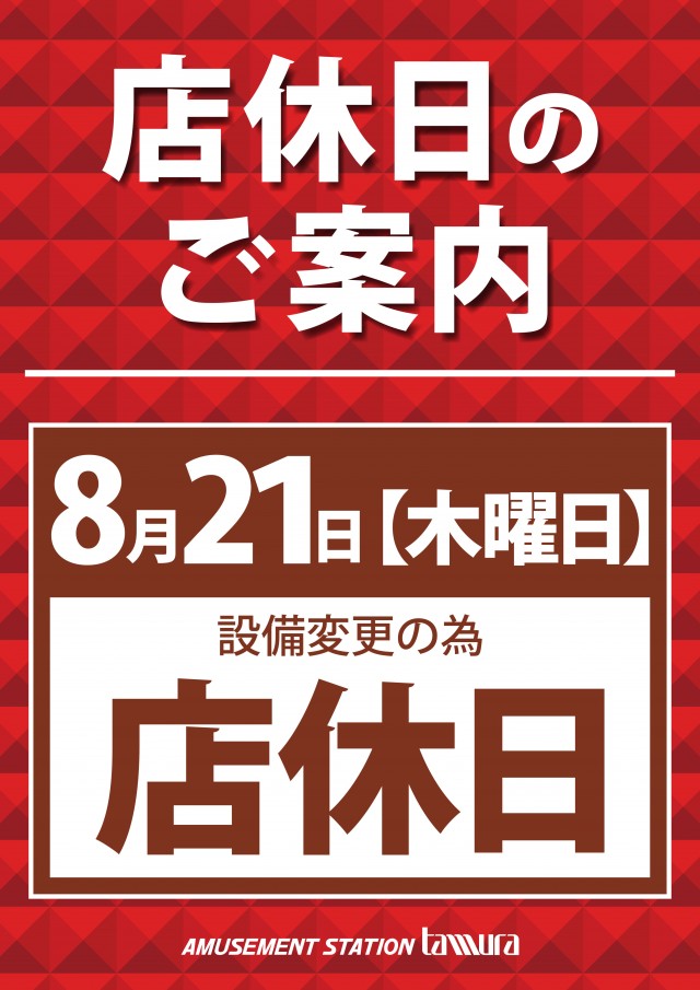 2025/08/21本日 店休日 お間違えの無いようにお願いいたします本日 8月21日(木) 店休日