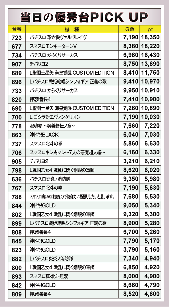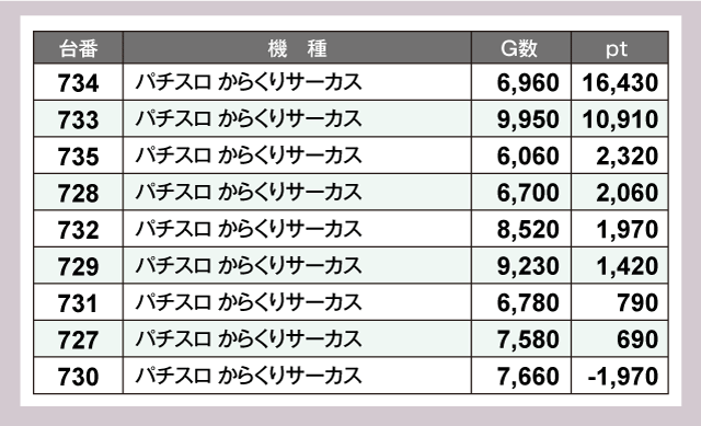 さらに『パチスロ からくりサーカス』では734番台+16,430pt、733番台+10,910ptと大盛況。