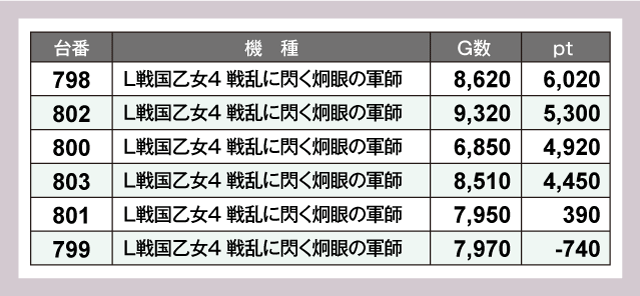 『L戦国乙女4 戦乱に閃く炯眼の軍師』は798番台の+6,020ptをはじめ、+4,000pt超えも複数見られるなど、大半の台が絶好調だったようだ。