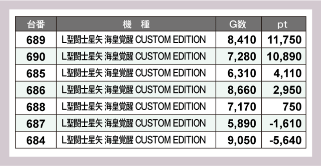 それだけではない。『L聖闘士星矢 海皇覚醒 CUSTOM EDITION』も689番台+11,750pt、733番台+10,910ptとそこかしこで万枚が誕生し、スロットコーナーを華やかに彩っていた。