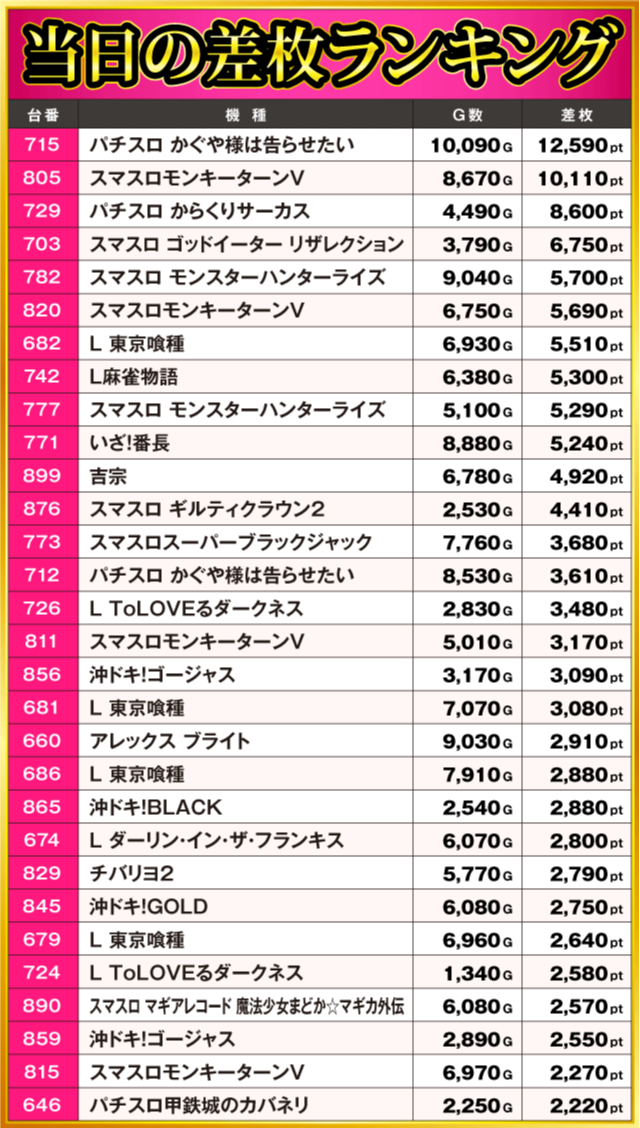この日、最もプレイヤーの注目を集めたのが『パチスロ かぐや様は告らせたい』で、715番台が+12,590ptを叩き出しランキングトップに。さらに、『スマスロモンキーターンV』も万枚超を達成、続く『パチスロ からくりサーカス』が+8,600ptを記録するなど、人気のスマスロを中心にハイスコアが続出し店内を盛り上げていた。