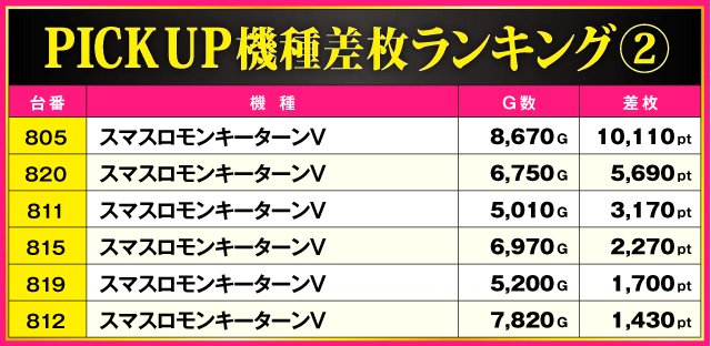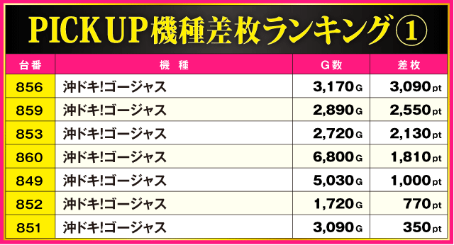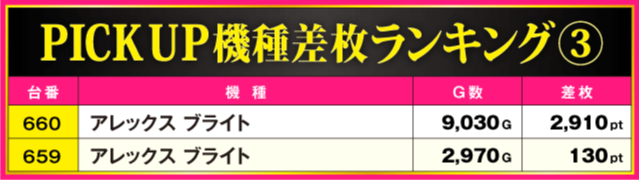 今回のPICK UP機種は全3機種で、『沖ドキ!ゴージャス』からは+3,090ptに+2,000pt超が2台発生。また、『スマスロモンキーターンV』は万枚超以外にも+5,690ptが確認されている。さらに『アレックス ブライト』は設置されている2台がともにプラス差枚となっているだけに、ファンにとって充実の一日となったのは間違いないだろう。