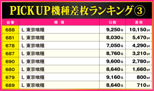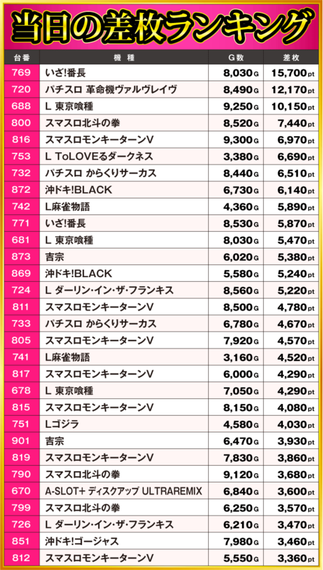 この日、最もプレイヤーの注目を集めたのが『いざ!番長』で、769番台が圧巻の+15,700ptを叩き出しランキングトップに。さらに、『パチスロ 革命機ヴァルヴレイヴ』が+12,170pt、『L 東京喰種』が+10,150ptを記録。差枚ベスト3が全て万枚超を達成する盛況ぶりを見せ店内を盛り上げていた。