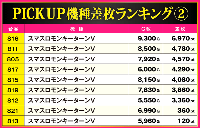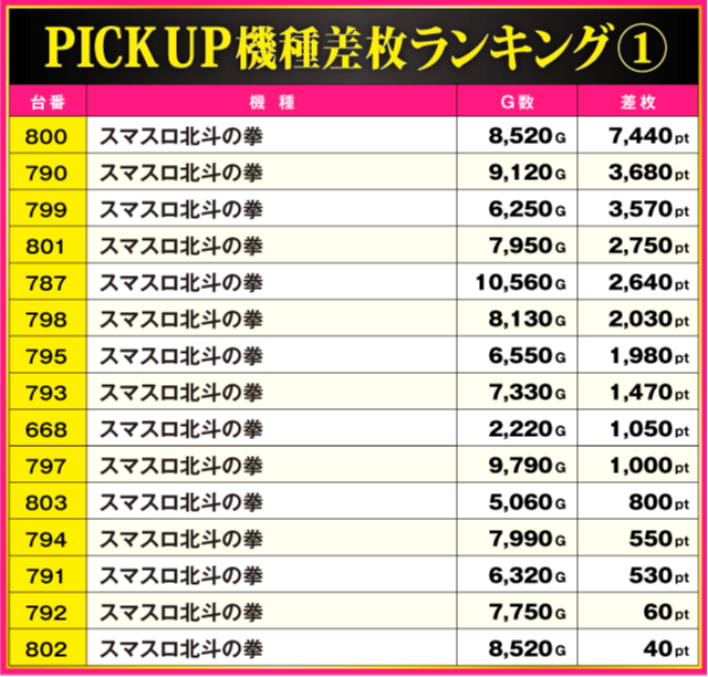 次にPICK UP機種の状況をチェックしていくと、『スマスロ北斗の拳』からは+7,440pt、『スマスロモンキーターンV』からは+6,970ptが発生。また、万枚超が飛び出した『L 東京喰種』は、他にも+5,470pt、+4,290ptといった好成績が確認されており、それぞれのシマは常にファンの笑顔と活気に満ち溢れる一日となった。