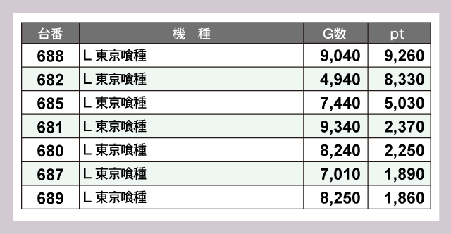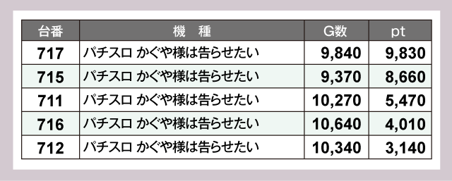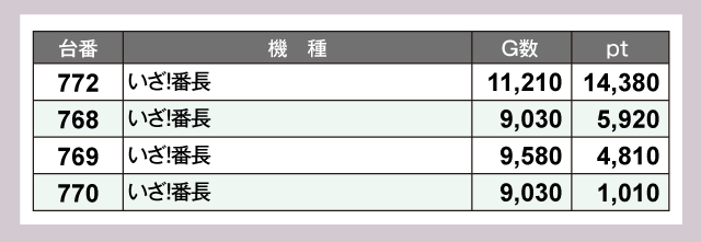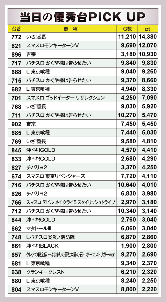 1万ptを突破したのは3台。『いざ!番長』772番台が+14,380pt、『スマスロモンキーターンV』821番台が+12,070pt、『吉宗』896番台が+10,930ptと圧巻の成績が並んだ。そして『パチスロ かぐや様は告らせたい』717番台が+9,830pt、『L 東京喰種』688番台が+9,260ptとつづく。以下にも『パチスロ かぐや様は告らせたい』715番台の+8,660ptなどなど、優秀台が詰まった見応えのあるデータとなっていた。