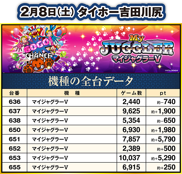 「マイジャグラーⅤ」は8台中6台がプラスとなり、4台が約+1,900pt以上!!
