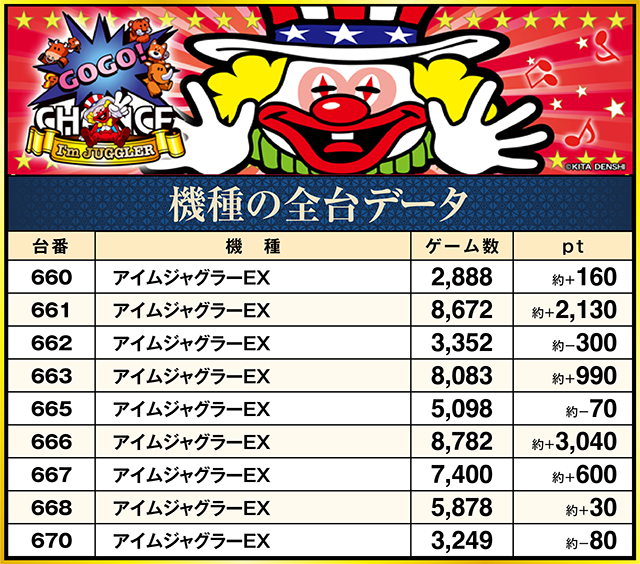 「アイムジャグラーEX」では、666番台が約+3,000ptオーバー。