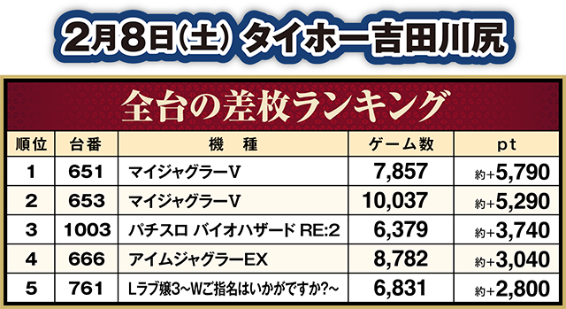「マイジャグラーⅤ」の651番台が約+5,790pt!