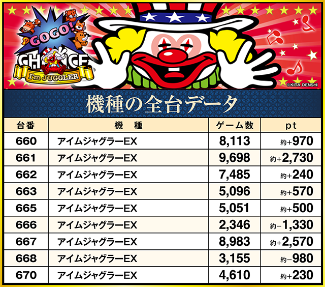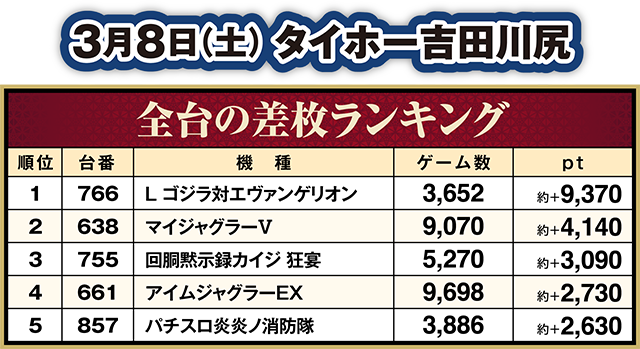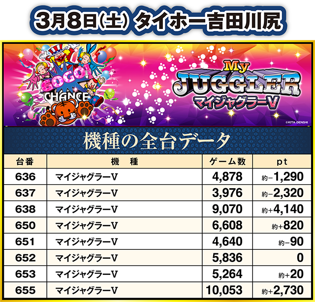 「マイジャグラーⅤ」の638番台も約+4,100ptを上回った。