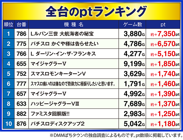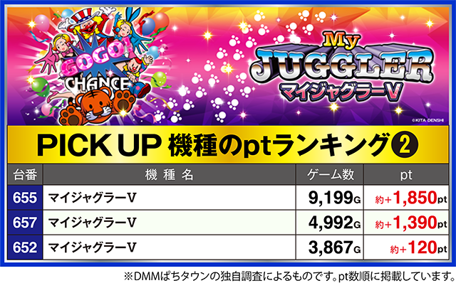 「マイジャグラーⅤ」では、655番台が約+1,850ptとなった。